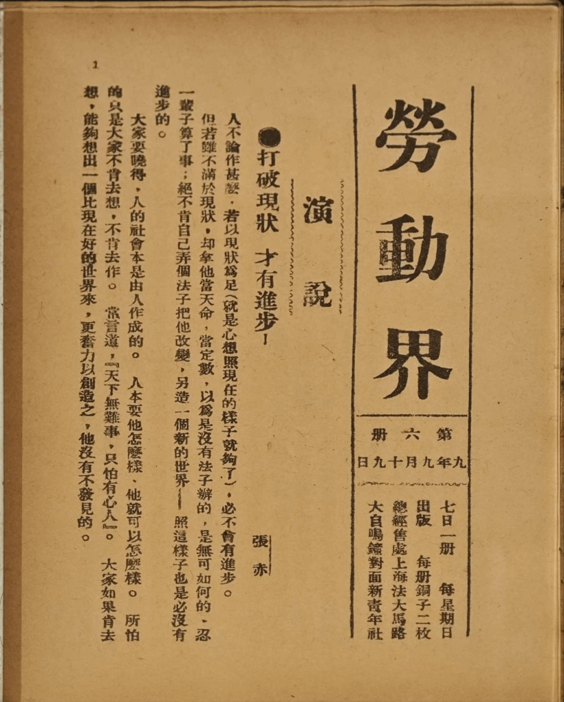 说起变革,倒确实在一旁的展柜里看到了《劳动界》的一篇文章节选。文字铿然,仿佛掷地有声,感觉现在的社会容不下这么呼吁变革的文字了——