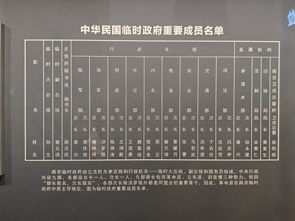 又在旁边的墙上见到辛亥革命以后孙中山政府的成员名单,见到许多黎元洪、黄兴、蔡元培、于右任、宋教仁之类熟悉的名字。不禁感叹历史课本常常将历史人物局限在他的某个职务或生命中的某个时段,而其他材料也常以课本为准,将人物碎片化,难见全貌。于是念及某人只能想到他的部分生平,很难扩展到全部人生。
